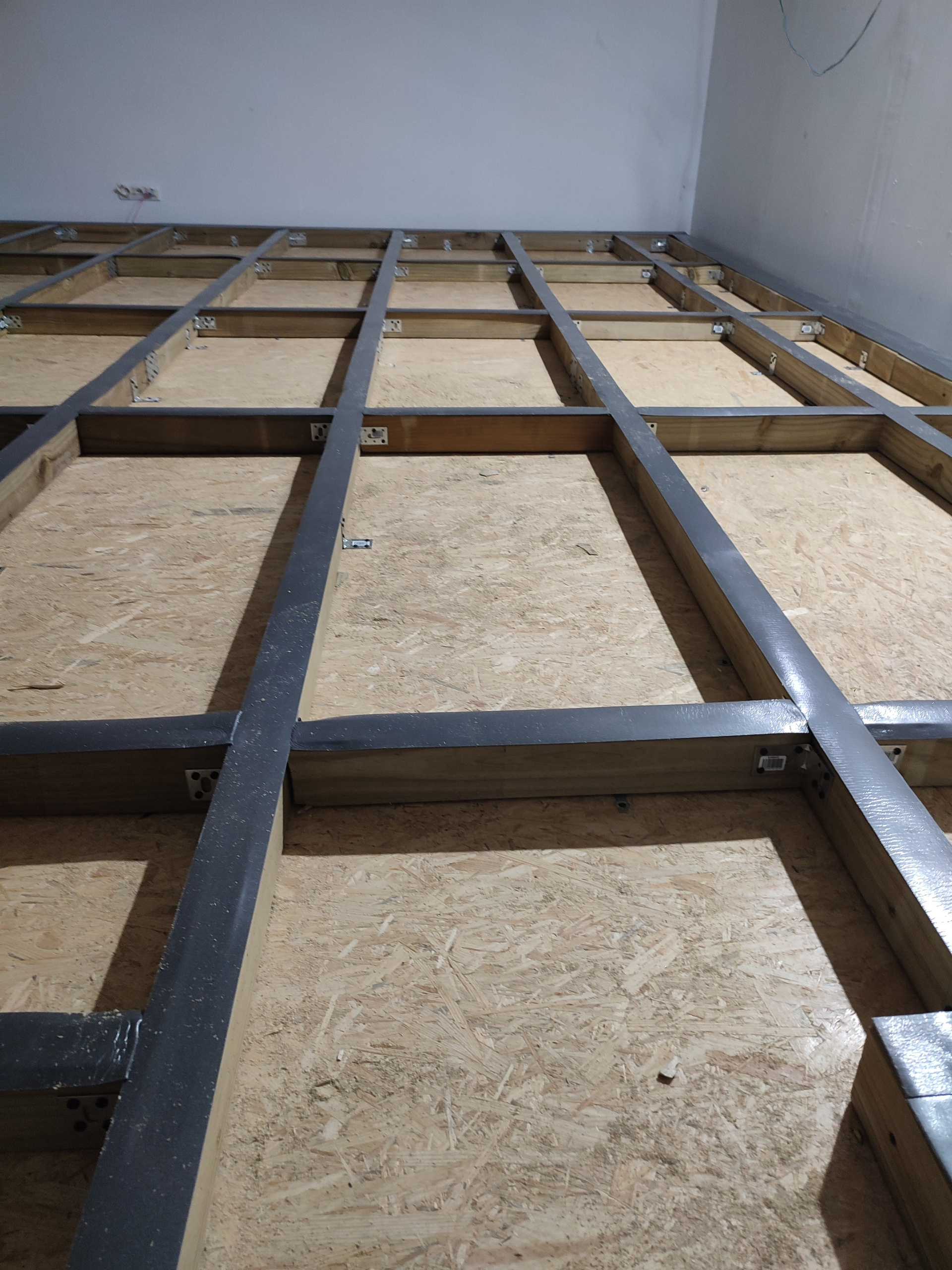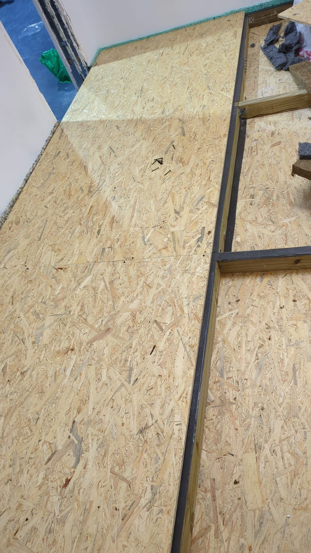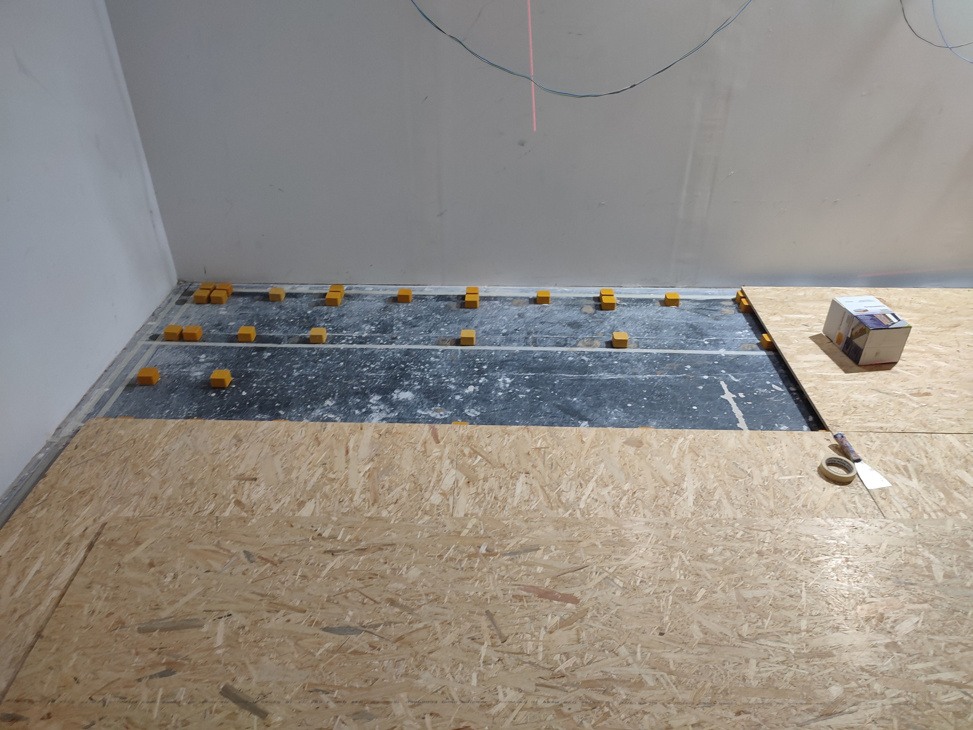 а. Instalación de suelo sobre almohadillas amortiguadoras.