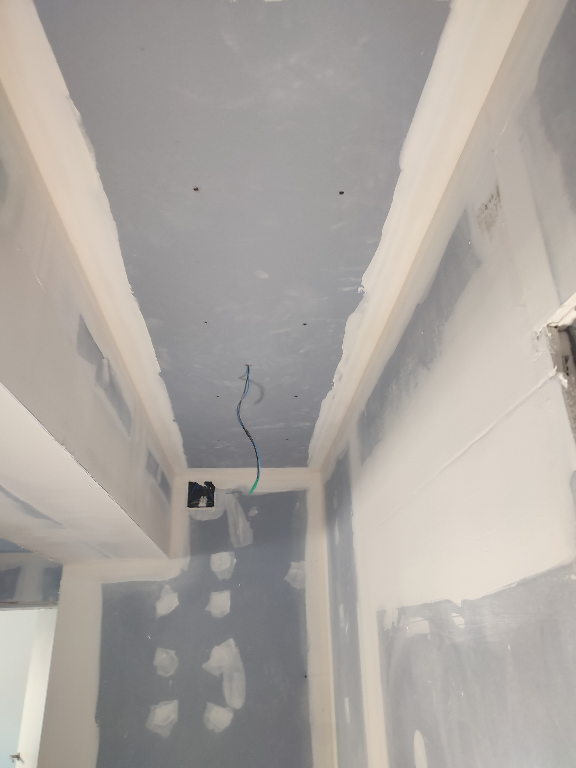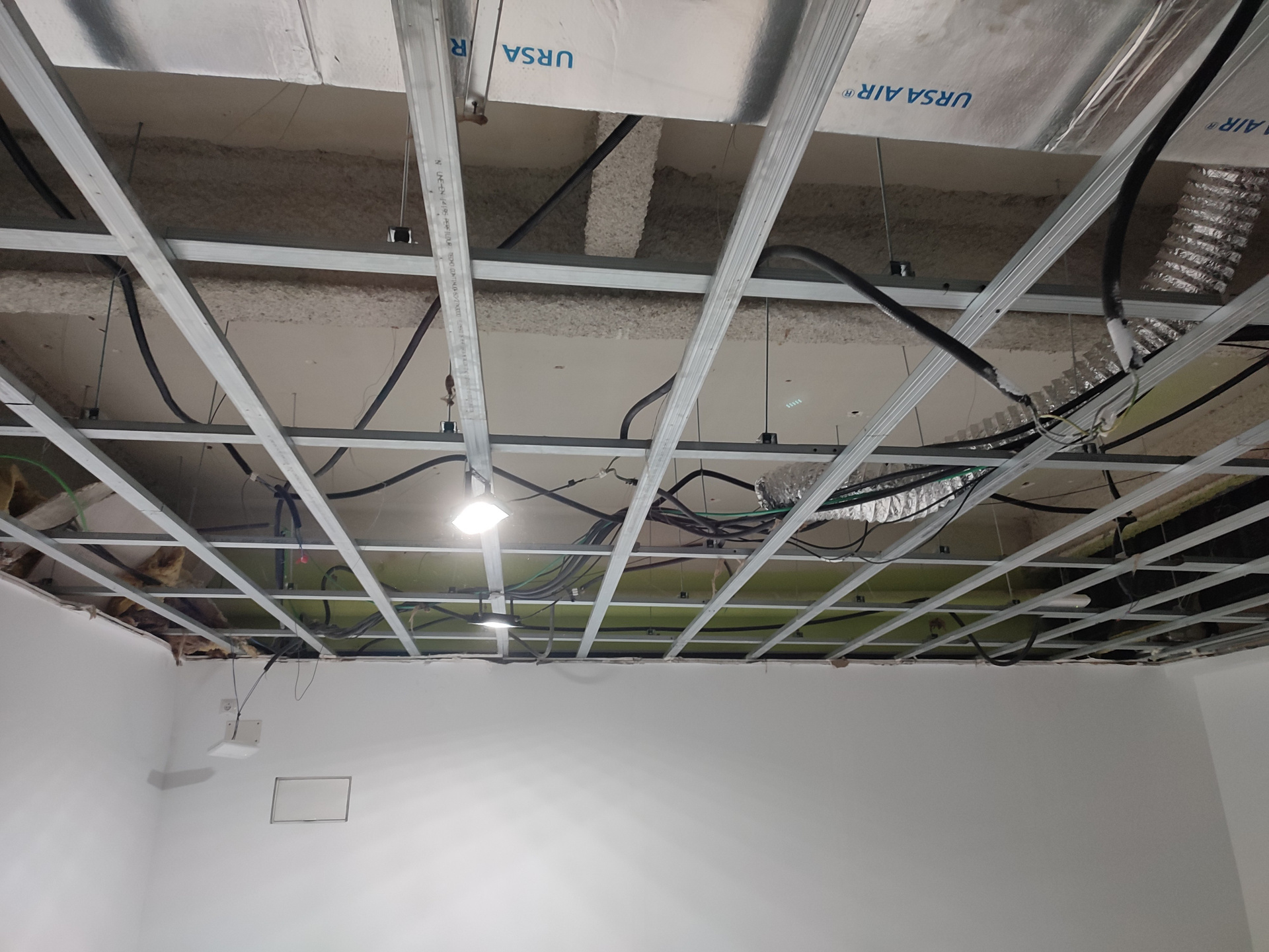 4. Masillado de juntas. Pintura. Instalación de luminarias, enchufes, interruptores y reguladores de velocidad de los ventiladores de conducto. Colocación de moqueta.