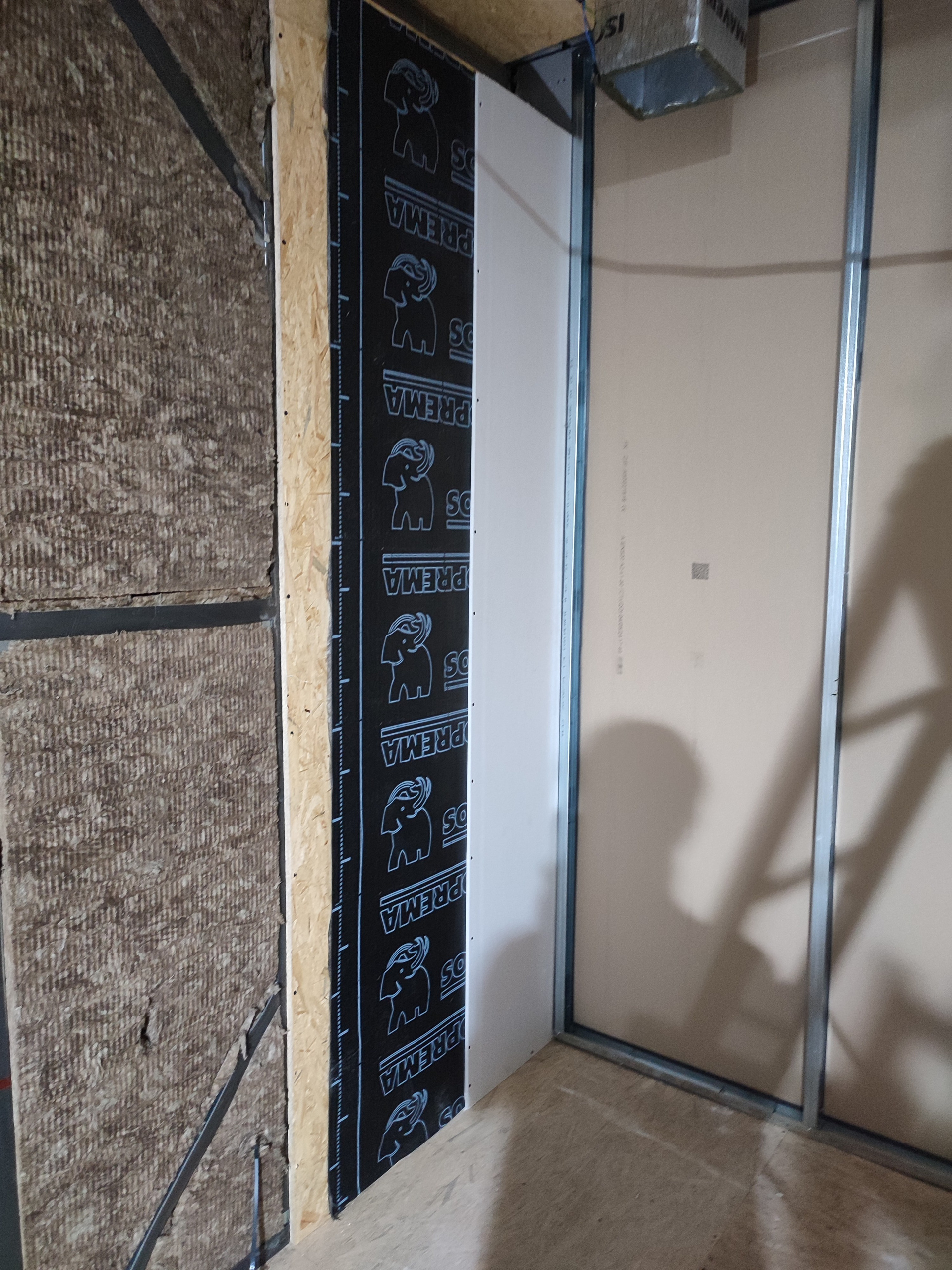 2. Elevación del techo 58 cm. Ampliación de las paredes hasta la altura del nuevo techo. Reubicación del extractor y de la entrada de aire. Adición de una nueva entrada de aire con la instalación de una trampa de sonido.